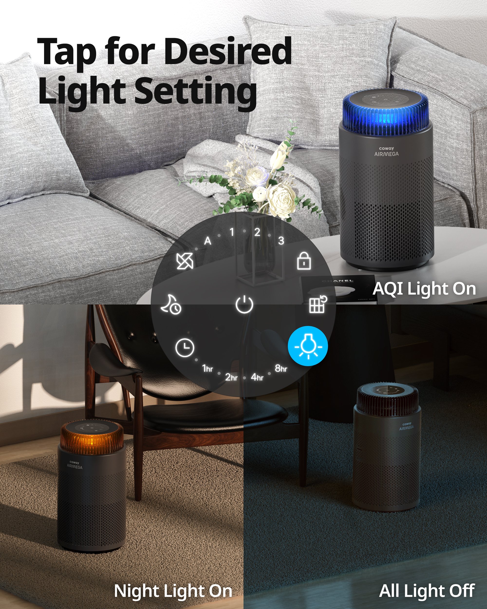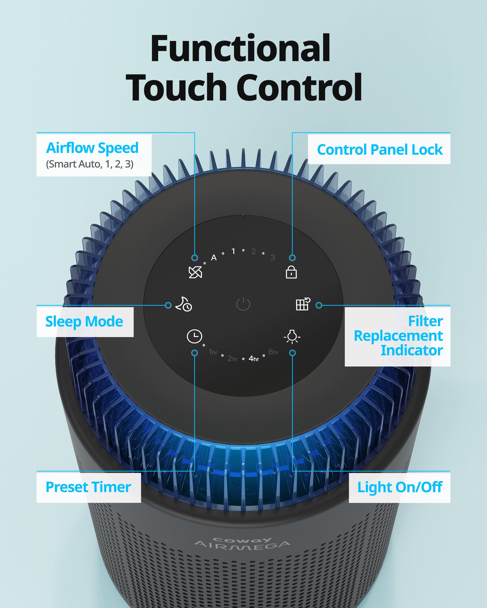To save even more energy when you leave home, you can set the Airmega 100 to automatically turn off after 1, 2, 4 or 8 hours