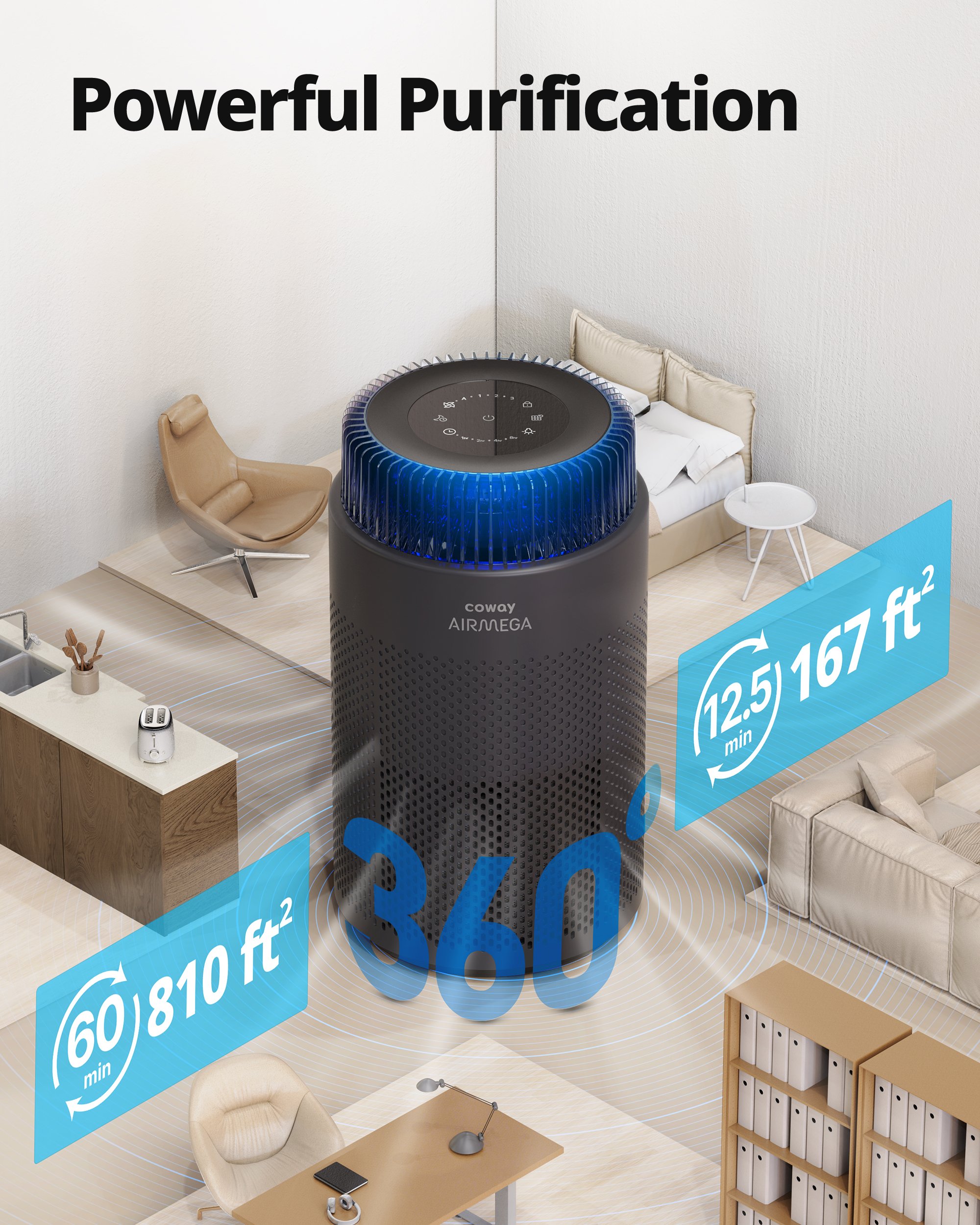 1Coway air purifiers has been proven to trap dust, pollen, dander, viruses and bacteria in the air based on KCL (Korea Conformity Laboratories) testing.They have been tested in a 30㎥ size chamber according to the Korea Air Cleaning Association standard (SPS-KACA 002-132:2022 Modified) to measure the 0.01㎛ size of particle removal rate. It was tested on maximum airflow speed in normal room temperature and humidity conditions. The performance may vary in the actual living environment of customers.