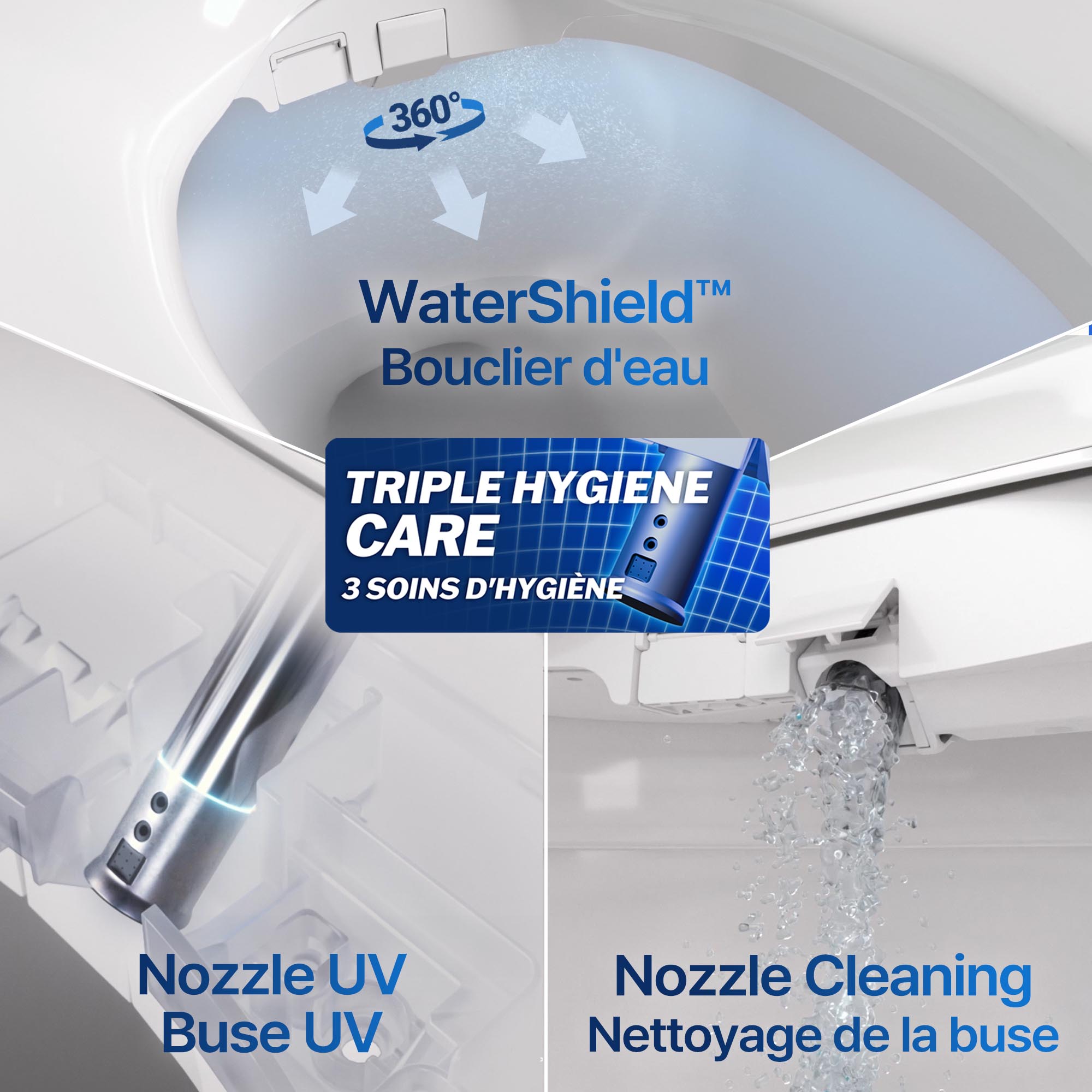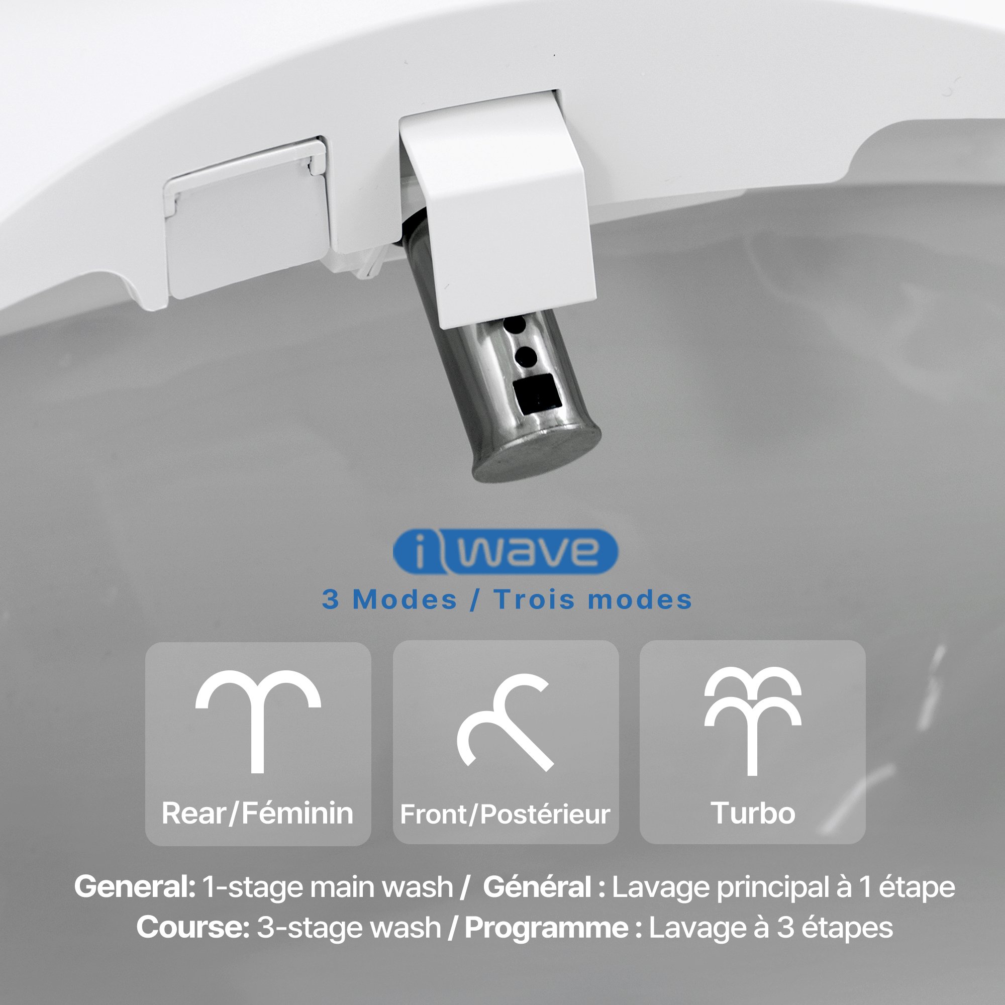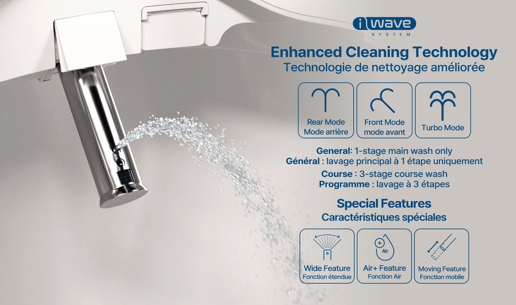 i-wave™ multi-stage wash care system that customized water pressure, motion, and spray patterns to suit each user's preferences. Choose from a 3-stage course wash or 1-stage general wash.