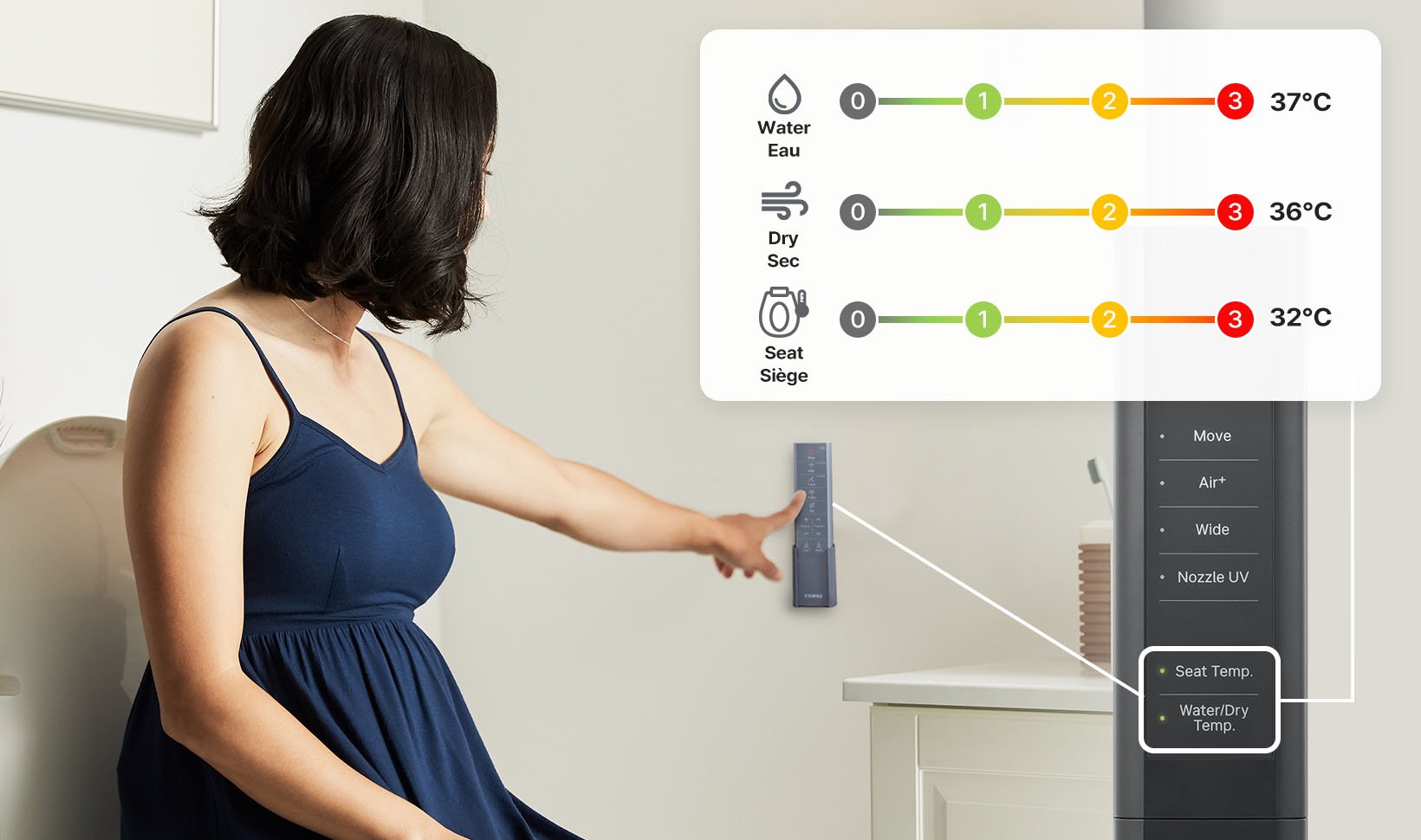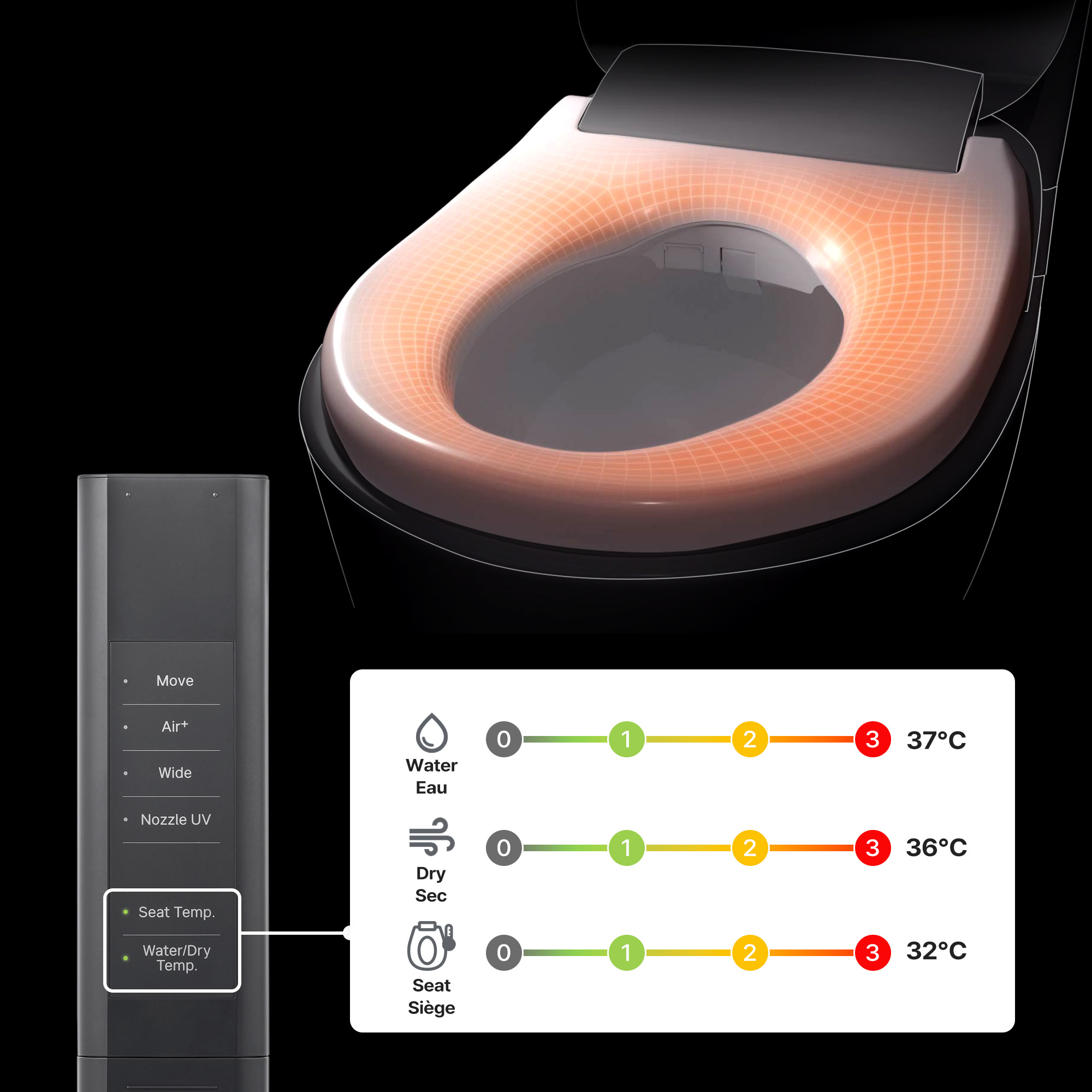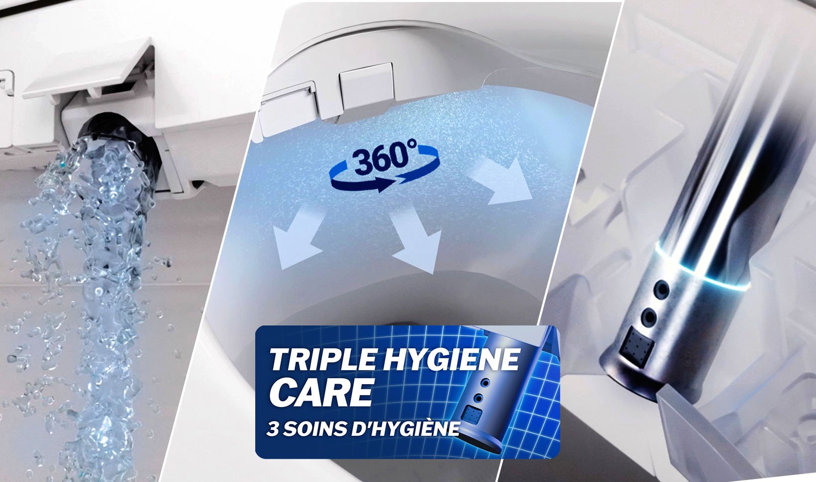 i-wave™ multi-stage wash care system that customized water pressure, motion, and spray patterns to suit each user's preferences. Choose from a 3-stage course wash or 1-stage general wash.