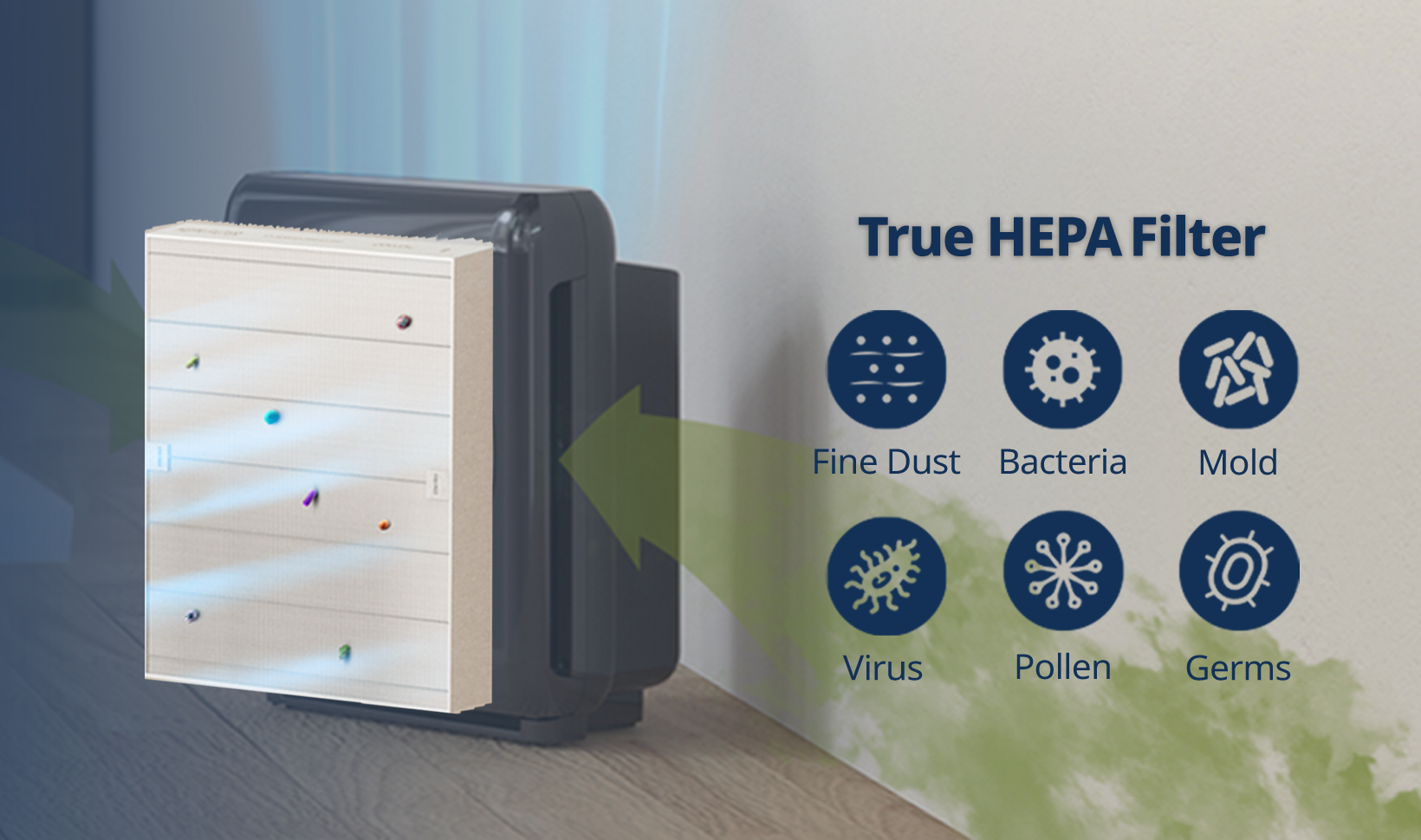 299.97% of viruses, bacteria, fungi and pollen were verified to be removed from the air for Coway air purifiers which have Green True HEPA™ filter applied based on the Japan Food Research Laboratories(JFRL) testing according to JEM 1467 standard.