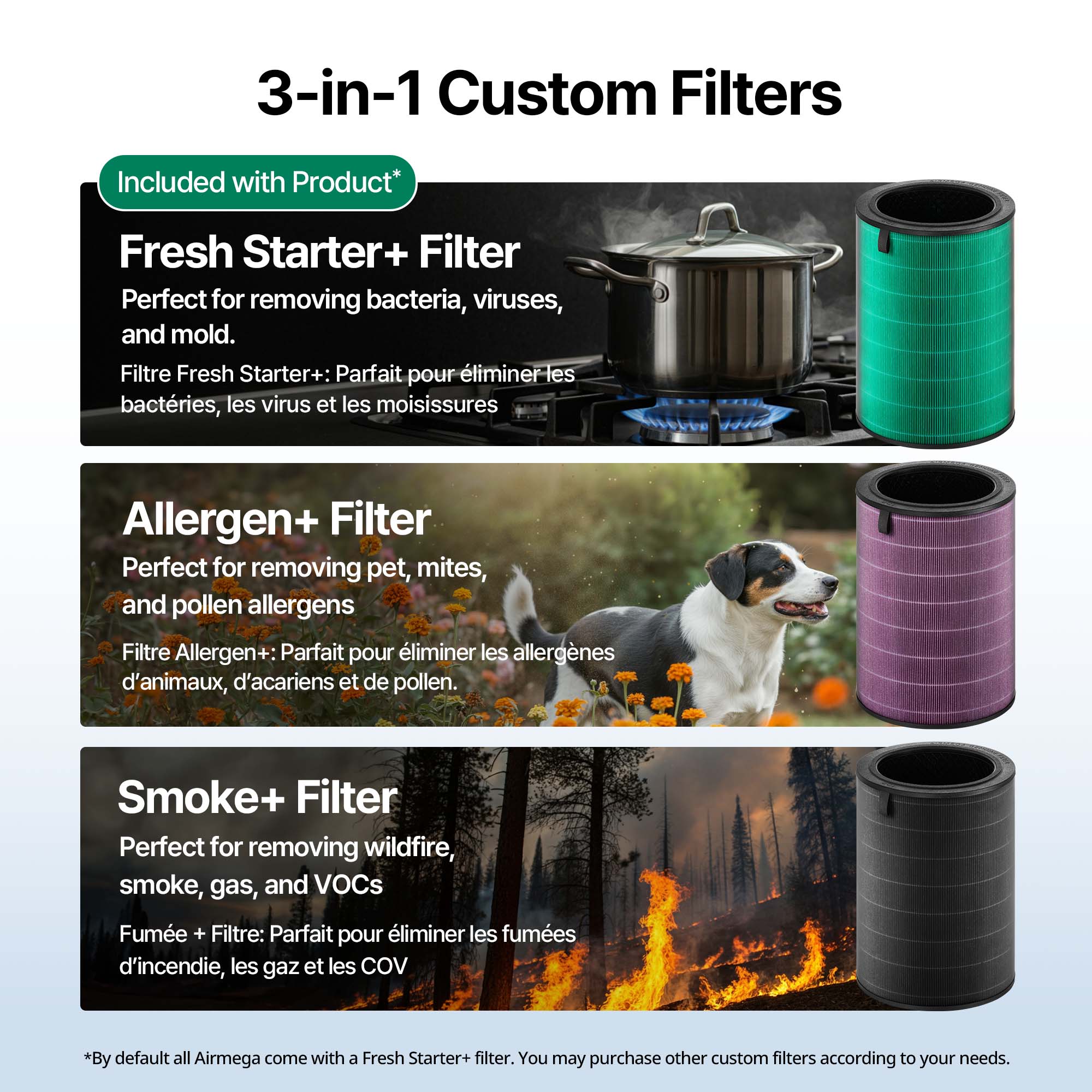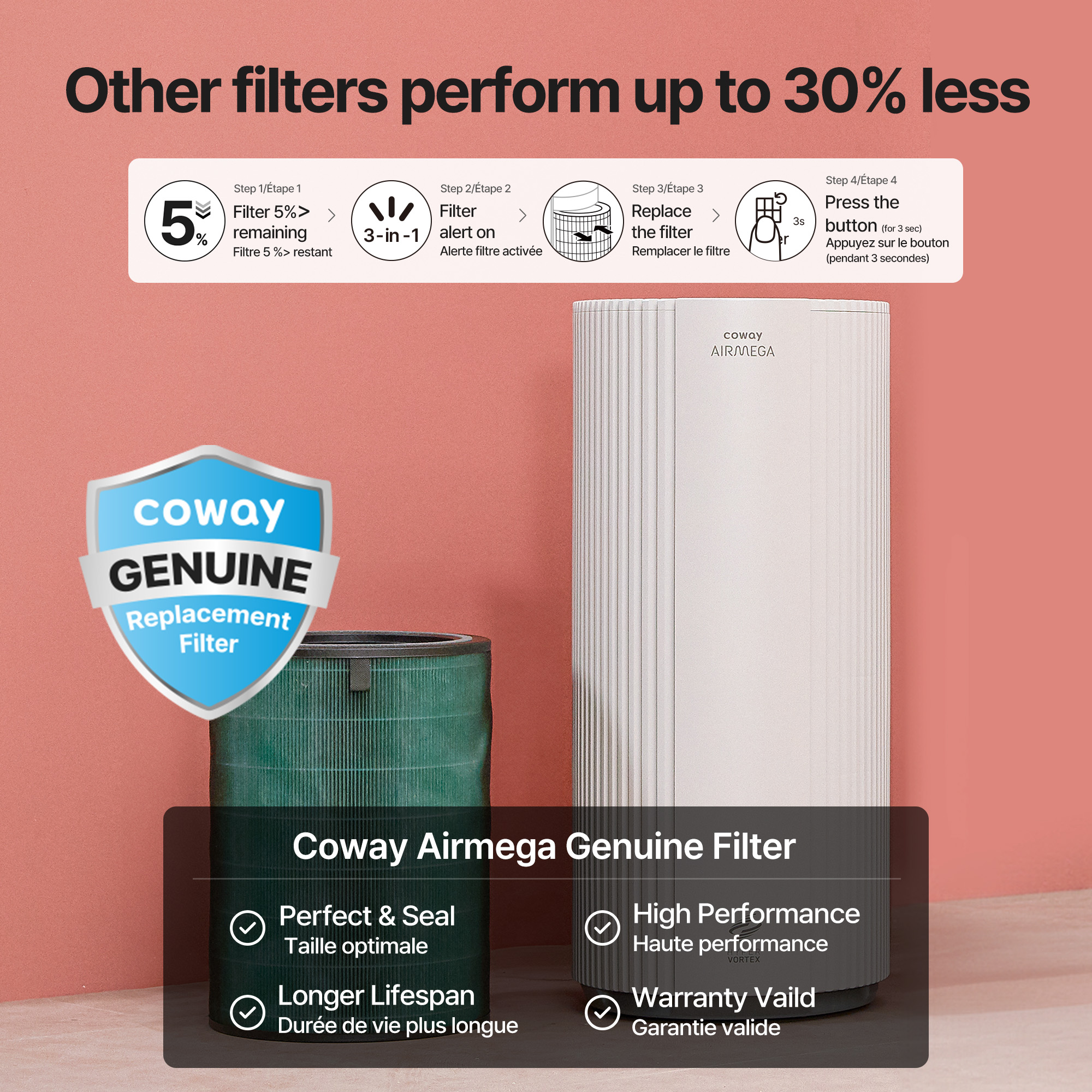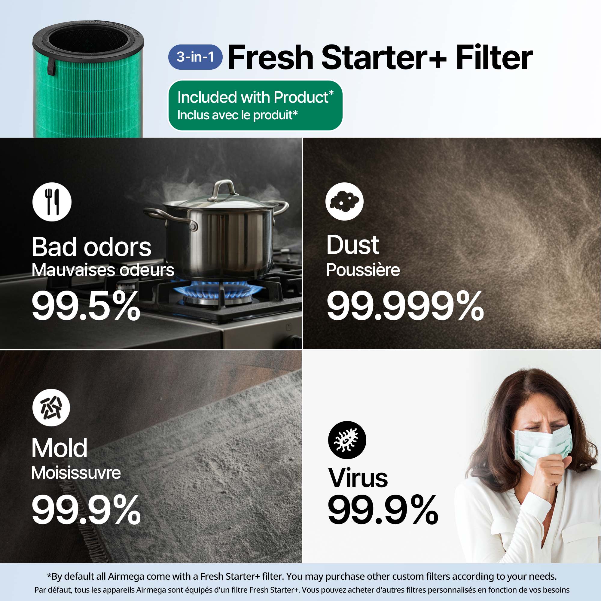 2Our HEPA filter complies with IEST-RP-CC007 standards at speed level 1 as tested by SGS (Société Générale de Surveillance). SGS's test report only reflects SGS's evaluation of the sample and does not reflect the evaluation of the batch of goods from which the sample was taken. Tested with Airmega 100, 150, 160, Mighty AP-1512HH, MightyS AP-1512HHS, 200M, 230, 240, 250, 250S, 250 Art, 300, 300S, 350, 400, 400S, 450, ProX