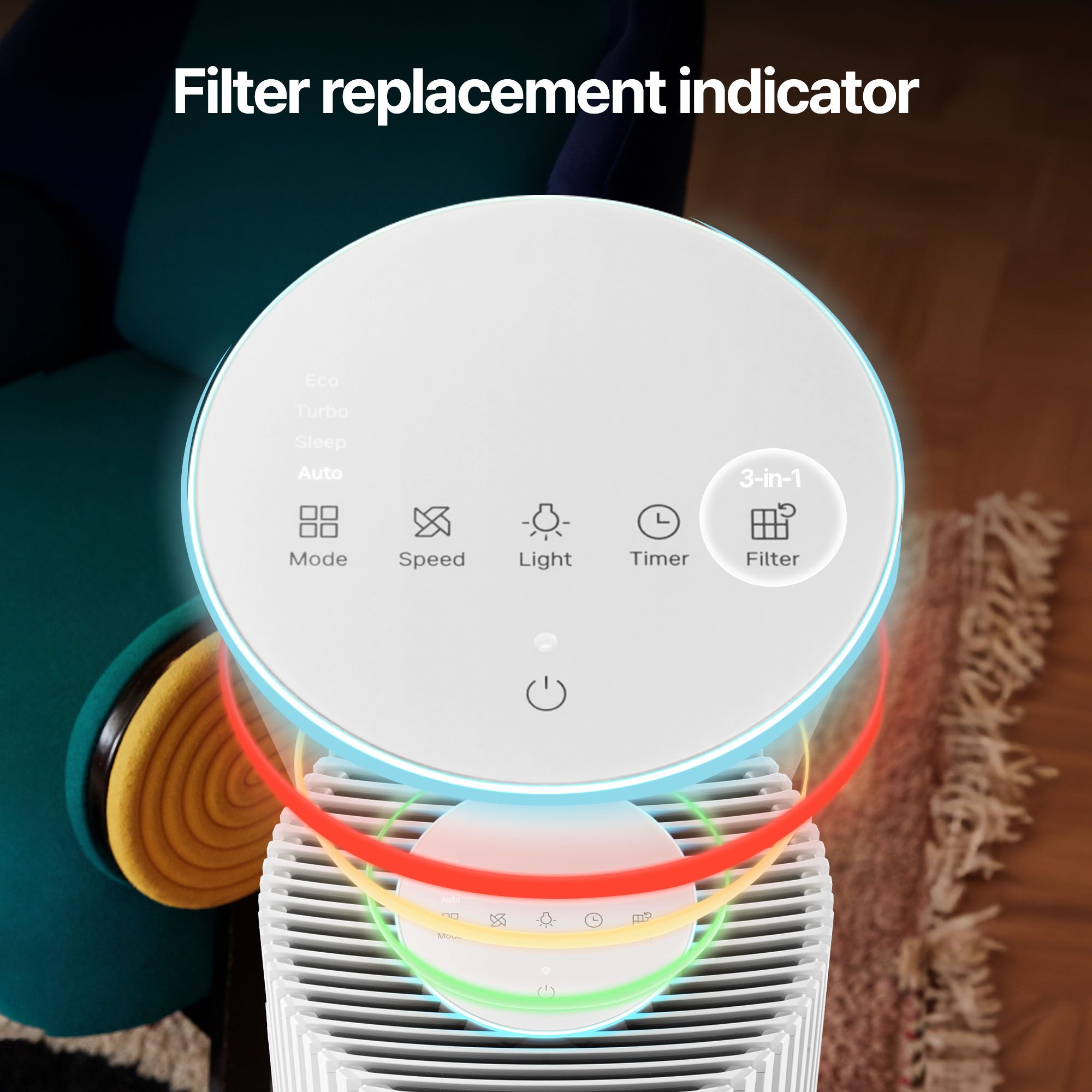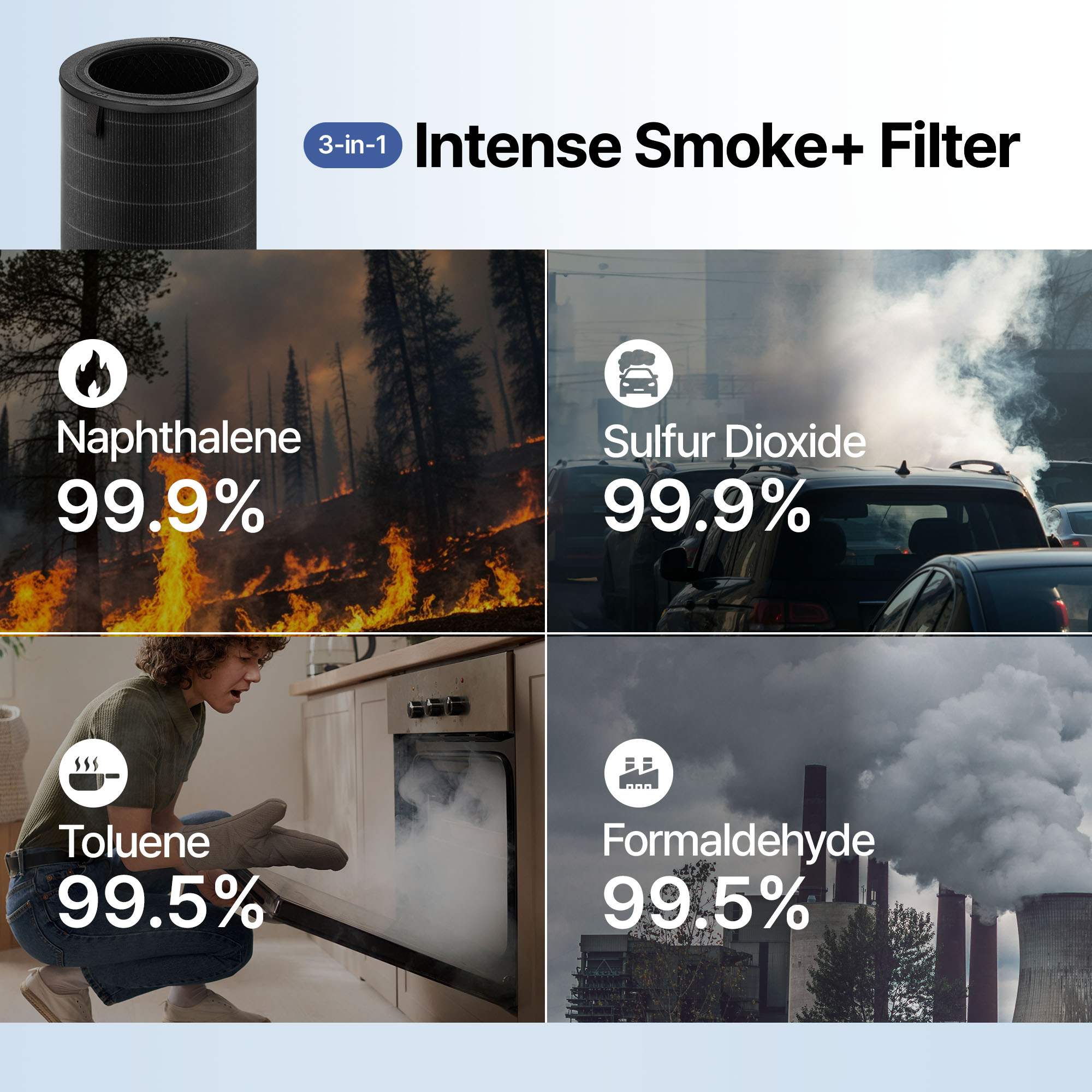 4 Tested by KCL(Korea Conformity Laboratories) according to SPS-KACA002-132:2022, showed result of over 99.5% removal rate of common household gases including Ammonia, Acetaldehyde, Acetic acid, Formaldehyde, Toluene, Benzene, Nitrogen dioxide (NO₂), and Sulfur dioxide (SO₂) within 30 minutes. Results may vary in different environments and not all odors or gas particles may be removed. Tested with Airmega MightyS AP-1512HHS, 250S, 300S, 400S, 350, 450