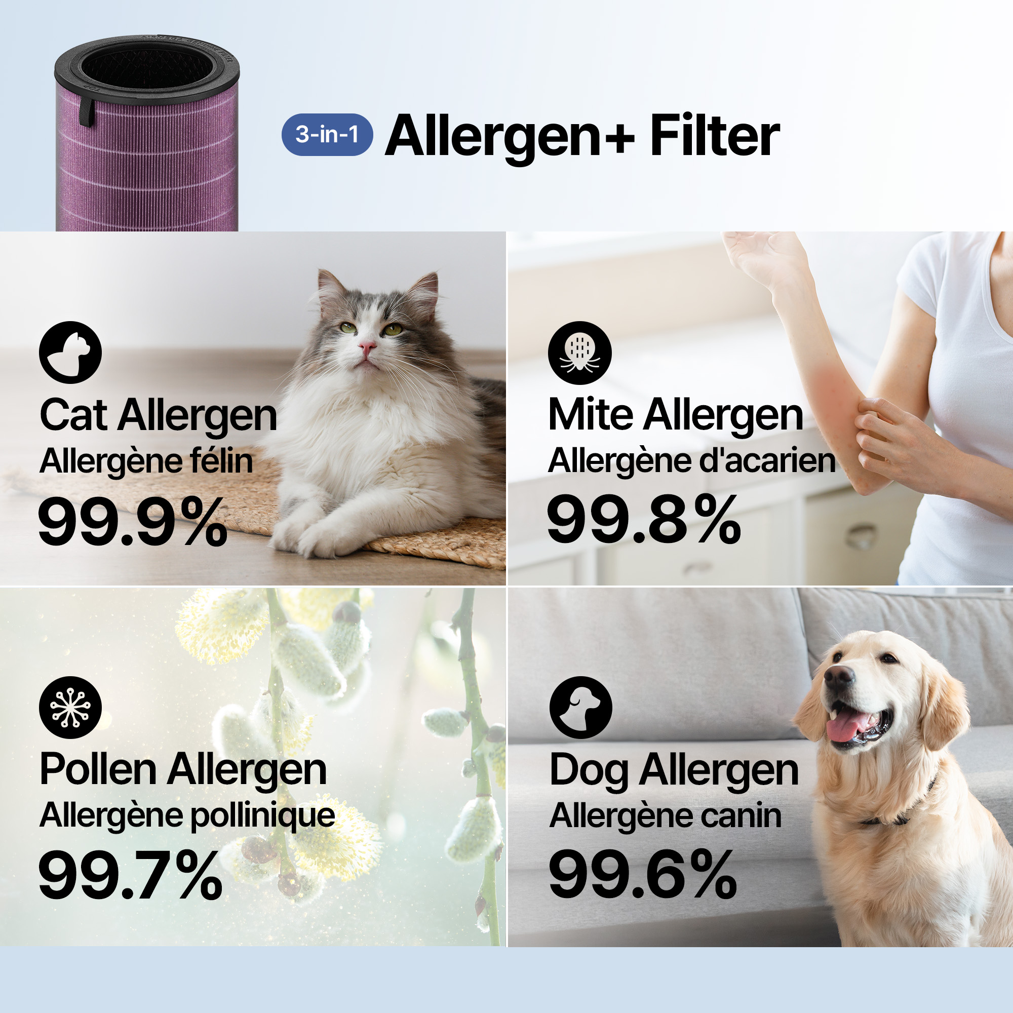 10 Tested by the Guangzhou Institute of Microbiology, exposed the filter media to protein solutions for 24 hours under ISO 4333-2022 standard. The results showed strong reduction performance: >99.79% for pollen, >99.60% for dog allergen, >99.90% for cat allergen, and >99.80% for dust mites matter allergen. Actual results may vary depending on room size, airflow, and pollutant levels. Tested with Airmega 350, 450
